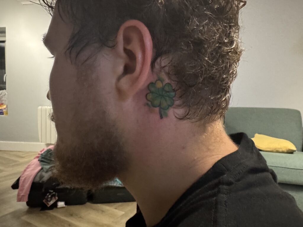 Day Eleven was a VERY interesting day. But this needs some context to explain the first activity. So, Grace and I had both been talking about getting a tattoo while we were in Ireland. This would be a great way to commemorate this trip. Grace was just thinking about it, while I had one already planned if I had the time and resources to get it. So, I told her that if she was serious about getting one, to let me know later on and we would go and get them. Fast forward to Thursday the 15th – Day ten – and Grace texted me asking if I wanted to get a tattoo still. I thought about it, and thought to myself that I would regret it if I didn’t. I did research and found a good place to do it called Sphynx Tattoo. Back to the start of Day Eleven, Grace made us sausage rolls she got while she was in Glasgow. These were really good and filling which was good for our tattoo adventure later. Once noon rolled around, we departed on our journey. We both had our designs picked out. Grace had a harp with flowers that she wanted to get on the back of her arm, and I wanted to get a four leafed clover behind my left ear. And I decided I wanted to get it in color, as I had some euros to spare and thought it would look nicer. We got to the tattoo place, got set up, and it was time. I was not sure how much my tattoo would hurt, because I had been told mixed things by people. Once my artist started, it didn’t feel that bad. But soon, it began to really hurt. I clenched my fist and endured the pain. I think when she was shading it was when it really hurt, it felt like a knife was being dragged against my skin. But my tattoo really took only about 30 minutes to get, so it wasn’t terrible. It just felt longer because of the pain. But once I got a look at it, it was all worth it. I got the green splashed onto it almost like it was a paint splash. And once I cleaned it off later, it looked really nice.