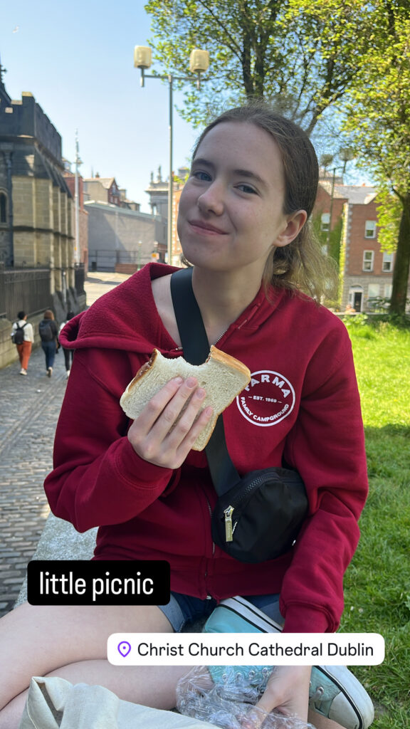 Today, Kira and I decided to go out and have a picnic on our second to last free day of the trip. We had to run to Lidls to get some food to make our lunch. We have been wanting to try the donuts they have there, so we both picked out one each, and I got a mini baguette. We then headed over to the little park connected to Christchurch and ate our sandwiches, donuts, and chips. We also shared some of our food with the seagull who mysteriously appeared behind us. We were just sitting there and turned around to see a seagull staring at us.